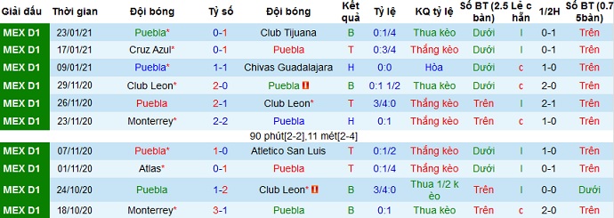 + Thống kê 10 trận gần nhất của Puebla
