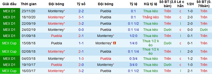 + Lịch sử đối đầu Puebla vs Monterrey