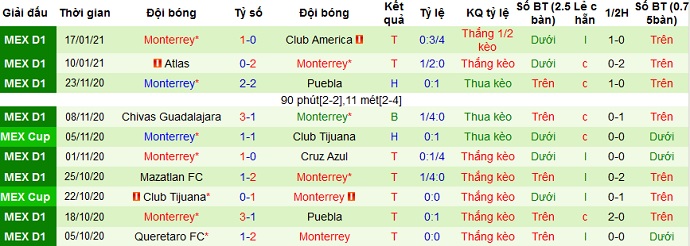 + Thống kê 10 trận gần nhất của Monterrey