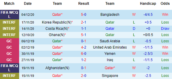 + Thống kê 10 trận gần nhất của Qatar
