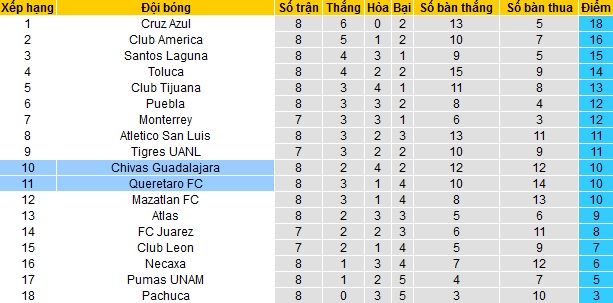 Sau 8 vòng đấu tại giai đoạn lượt về giải vô địch quốc gia Mexico, cả Querétaro và Guadalajara Chivas đều đang có được 10 điểm và cùng nằm trong nhóm các đội có suất dự play-off.