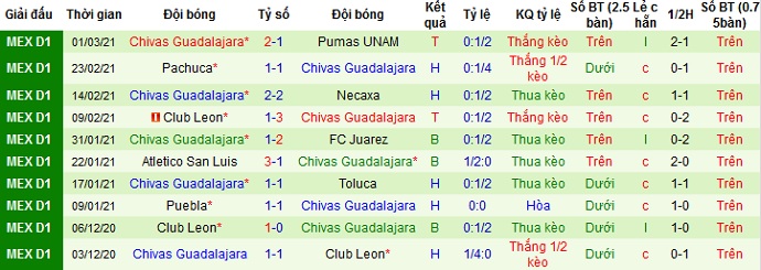 + Thống kê 10 trận gần nhất của Guadalajara Chivas