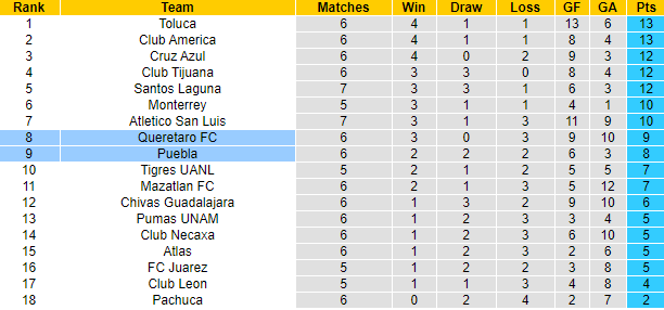 Sau 6 vòng đấu tại giải VĐQG Mexico mùa này, Queretaro giành 9 điểm, Puebla có 8 điểm, hai đội chia nhau các vị trí thứ 8 và thứ 9 trên bảng xếp hạng. Trận đối đầu sắp tới Queretaro có lợi thế rõ ràng khi được thi đấu trên sân nhà.