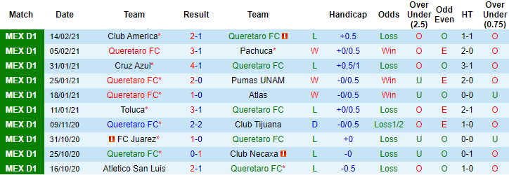 + Thống kê 10 trận gần nhất của Queretaro