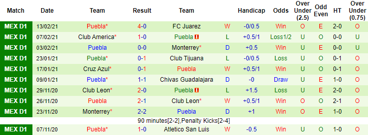 + Thống kê 10 trận gần nhất của Puebla