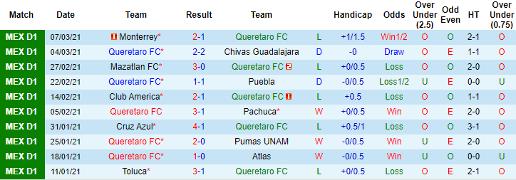 + Thống kê 10 trận gần nhất của Queretaro