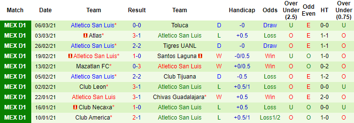 + Thống kê 10 trận gần nhất của San Luis