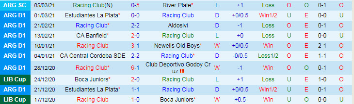 Racing Club khởi đầu giải VĐQG Argentina 2021 với bộ mặt thất thường khi không thắng cả 3 lượt trận đầu tiên. Chi tiết, họ chỉ có được 2 trận hòa và thua 1 lần ở chuỗi trận kể trên, qua đó đứng ở vị trí thứ 11 trong số 13 đội bóng có mặt tại bảng A.