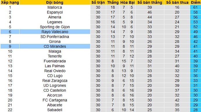 Trong khi đó Mirandés chỉ đang đứng thứ 9 trên bảng xếp hạng với 41 điểm cũng sau 30 vòng đấu. Hiện tại Mirandés đang bỏ xa nhóm cuối bảng tới 11 điểm, nhưng cũng kém các đội có suất dự play-off tới 8 điểm.