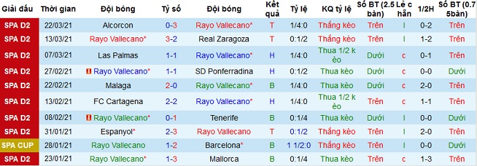 + Thống kê 10 trận gần nhất của Rayo Vallecano