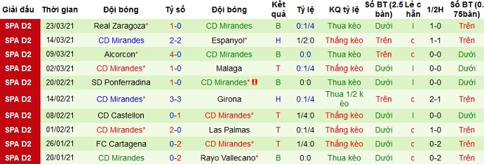 Tuy nhiên trong 5 trận đấu gần đây Mirandés chỉ có được 1 trận thắng, 1 trận hòa và để thua 3 trận. Trên sân khách thành tích của Mirandés cũng rất thất thường, sau 2 trận thắng đội bóng lại để thua 3 trận liên tiếp trong các lần du đấu gần nhất.