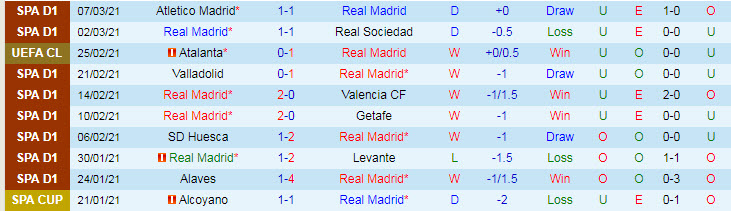 + Thống kê 10 trận gần nhất của Real Madrid