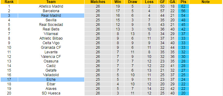 Niềm tin của Real Madrid càng gia tăng bởi Elche là đội bóng yếu bóng vía mỗi khi thi đấu xa nhà. Bằng chứng, họ thua tới 7 và chỉ có được 3 trận hòa ở 10 trận sân khách gần đây tại giải VĐQG Tây Ban Nha. Nhắc thếm, Elche đang là đội bóng đứng ở vị trí thứ 16 trên BXH và khó có thể ngồi chung mâm với Real Madrid ở thời điểm này.