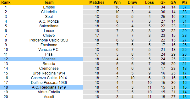 Xét về màn trình diễn thời gian gần đây thì rõ ràng Vicenza đang tỏ ra nhỉnh hơn so với chủ nhà ngày hôm nay. Reggiana chìm vào khủng hoảng với 5 vòng liên tiếp thất bại và nhìn xa hơn thì CLB này trải qua 8 vòng không thắng (hòa được 1 trận).