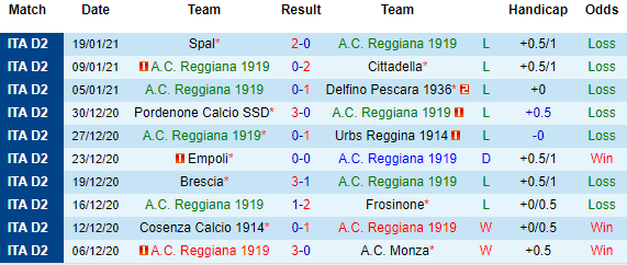 + Thống kê 10 trận gần nhất của Reggiana