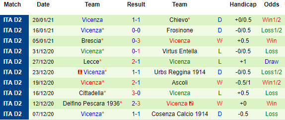 + Thống kê 10 trận gần nhất của Vicenza