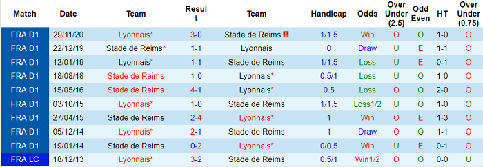 Phong độ và thống kê đối đầu Reims vs Lyon