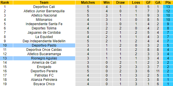 Dù vậy thì nhiệm vụ đó xem chừng không đơn giản. Rionegro Aguilas có 4 điểm/3 trận và đang đứng thứ 13, kém vị trí thứ 8 hiện tại đúng 3 điểm. Cách biệt như vậy là hoàn toàn có thể san lấp chỉ sau 1, 2 trận. Trong khi ấy, Deportivo Pasto thi đấu tốt hơn so với chủ nhà từ đầu mùa.