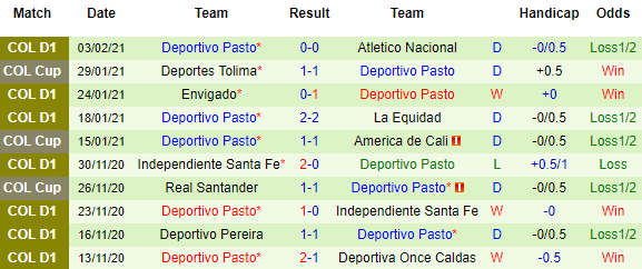 + Thống kê 10 trận gần nhất của Deportivo Pasto