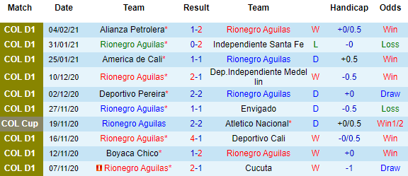 + Lịch sử đối đầu Rionegro Aguilas vs Deportivo Pasto