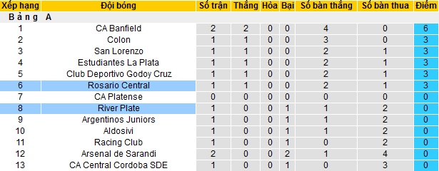 Bảng xếp hạng giải VĐQG Argentina vòng 2