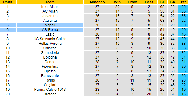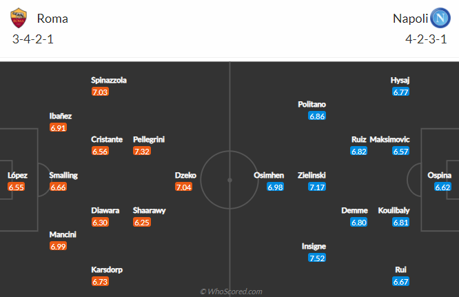Trong vòng 7 trận sân nhà gần đây tính trên mọi đấu trường, Roma thắng 6 trận. 9 lần làm khách trước đây trên sân Olimpico của Roma, Napoli cũng bị đánh bại 6 trận. Thành tích sân khách của Napoli mùa giải này cũng luôn bị nghi ngờ. 7 trận xa nhà gần đây Insigne và đồng đội chỉ thắng được đúng 1 trận, còn lại là 5 thất bại và 1 trận hòa.