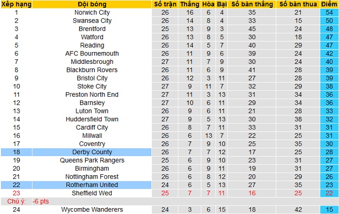 Bảng xếp hạng giải hạng nhấ Anh vòng 27