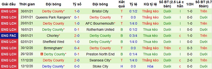 + Thống kê 10 trận gần nhất của Derby County