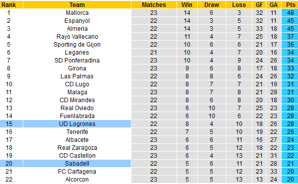 Tuy nhiên, thời thế lúc này đã đẩy Sabadell ra quá xa và thậm chí còn đối mặt với nguy cơ mất suất chơi kh chỉ đứng thứ 3 từ dưới lên với vỏn vẹn 1 điểm nhiều hơn đội bét bảng. Trong khi đó, Logrones lại khá thảnh thơi ở vị trí thứ 15 sau 22 vòng hiện nay.