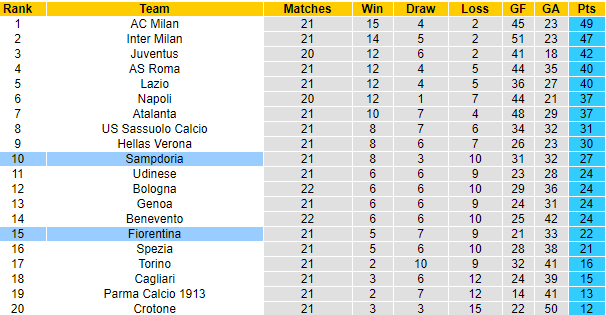 Phía chủ nhà Sampdoria, đội bóng này thuộc tầm trung tại Serie A, và vị trí của họ hiện cũng là thứ 10. Với 27 điểm trong tay, Sampdoria không cần lo lắng cho vấn đề trụ hạng, nhưng họ cũng khó vươn lên cạnh tranh suất dự Cúp châu Âu bởi cách biệt với nhóm đầu là rất xa.