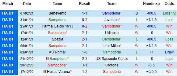 + Thống kê 10 trận gần nhất của Sampdoria