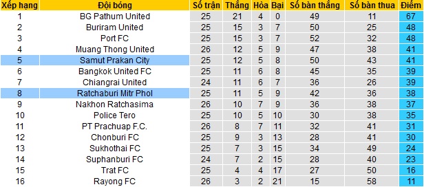 Trong khi đó Ratchaburi đứng dưới đối thủ 2 bậc ở vị trí thứ 8 với 38 điểm cũng sau 25 vòng đấu. Tuy nhiên khoảng cách của Ratchaburi với nhóm các đội cầm đèn đỏ hiện đã là 15 điểm nên đội bóng không còn phải bận tâm về chuyện trụ hạng, và cũng không còn mục tiêu cụ thể nào.