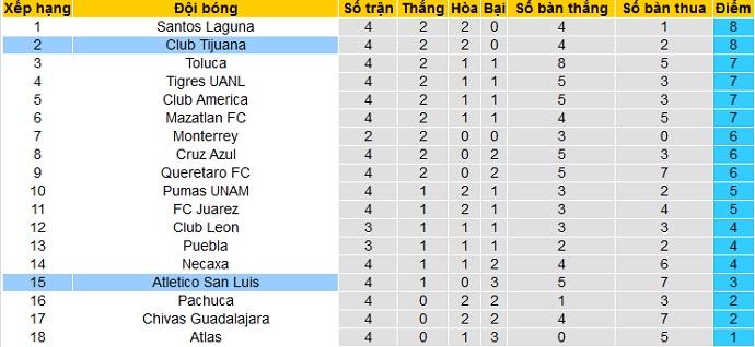 Bảng xếp hạng giải VĐQG Mexico trước vòng 5