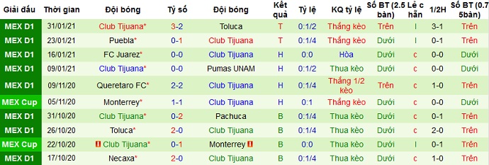 + Thống kê 10 trận gần nhất của Tijuana