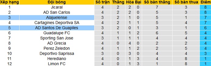 Bảng xếp hạng giải VĐQG Costa Rica vòng 4