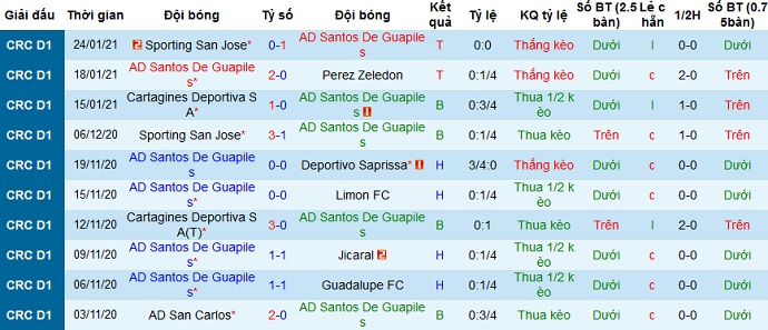 Trong 5 trận gần nhất Santos Guápiles có được 2 trận thắng, hòa 1 và để thua 2 trận. Thành tích sân nhà của đội bóng có phần tốt hơn khi đang bất bại cả 5 trận gần đây nhưng trong đó chỉ thắng được 1 trận, hòa ở cả 4 trận còn lại.