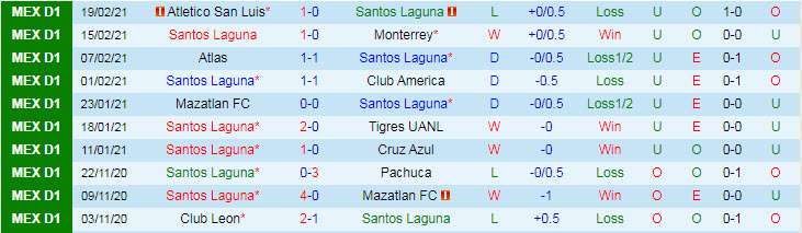 + Thống kê 10 trận gần nhất của Santos Laguna