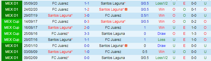 Phong độ và thống kê đối đầu Santos Laguna - Juarez gần đây: