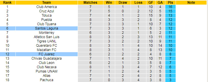 Bên kia sân, Juarez là tập thể có phong độ thất thường. Sau 6 trận, họ chỉ thắng 2, hòa 2 và nhận 2 thất bại, để rồi đứng ở vị trí thứ 12 trên BXH. Điểm cần lưu ý, Juarez từng thua 4 và hòa 1 ở 5 trận gần nhất chạm mặt Santos Laguna.