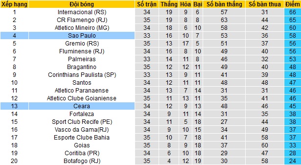 Trong khi đó Ceará vẫn chỉ đang đứng ngay dưới nhóm các đội có suất dự Copa Sudamericana ở vị trí thứ 13 với 45 điểm sau 34 vòng đấu. Tuy nhiên khoảng cách kể trên chỉ còn là 1 điểm, đồng thời Ceará vẫn đang có nhiều hơn nhóm cầm đèn đỏ cuối bảng tới 8 điểm.