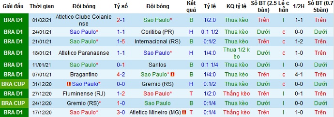 + Thống kê 10 trận gần nhất của São Paulo