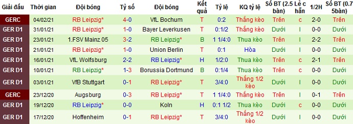 + Thống kê 10 trận gần nhất của RB Leipzig