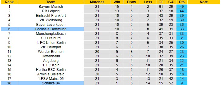 Tính từ đầu mùa giải tới giờ, Schalke chỉ thắng 1 trận, hòa 6 và nhận tới 14 thất bại, qua đó xếp ở vị trí cuối cùng trên BXH. Bên kia sân, Dortmund vẫn duy trì được vóc dáng của một đội bóng có sức cạnh tranh top 4 – nhóm tham dự Champions League mùa tới.