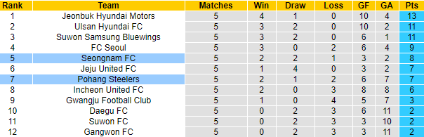 Phía đối diện, Pohang Steelers được đánh giá cao nhưng khởi đầu chưa tốt. Sau 5 trận, Pohang Steelers giành được 7 điểm và đang xếp dưới Seongnam. Màn trình diễn của Pohang thời gian gần đây không được ổn định như đối thủ.