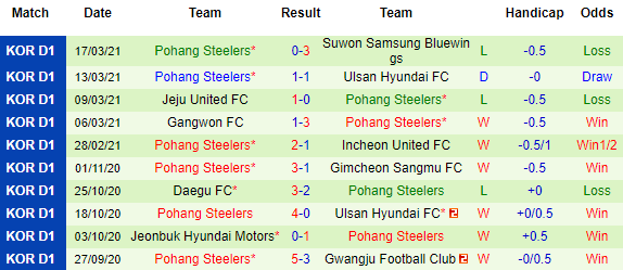 + Thống kê 10 trận gần nhất của Pohang Steelers