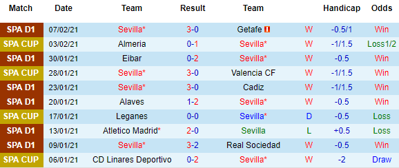 + Thống kê 10 trận gần nhất của Sevilla