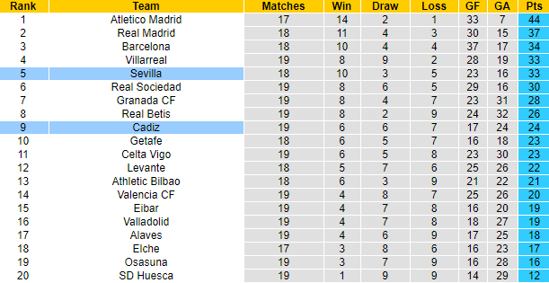Tuy nhiên Cadiz ở La Liga mùa này lại đang tạo ra nhiều sự tin tưởng. Hồi đầu mùa Cadiz từng đánh bại cả Barcelona và Real Madrid. 4 vòng đấu vừa qua tại giải đấu số 1 Tây Ban Nha, Cadiz bất bại với 1 chiến thắng và 3 trận hòa. Trong khi đó Sevilla giai đoạn gần đây lại cho thấy dấu hiệu phập phù, 3 trận vừa qua họ chỉ thắng được 1 trận với tỷ số 2-1 trước Alaves.