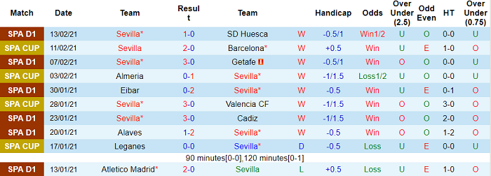 - Thống kê 10 trận gần nhất của Sevilla