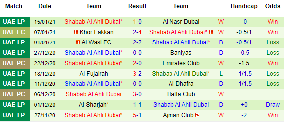 + Thống kê 10 trận gần nhất của Shabab Al Ahli Dubai