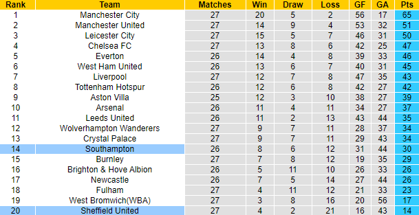 Sheffield United vẫn đang xếp ở vị trí đội sổ trên bảng xếp hạng Premier League 2020/21. Sau 27 trận, Sheffield United giành 14 điểm, ghi 16 bàn, thủng lưới 43 lần. Trong khi đó Southampton sau 26 trận đã giành được 30 điểm, xếp ở vị trí thứ 14. Trong vòng 3 trận đối đầu Sheffield United gần đây, Southampton toàn thắng. Vì vậy việc Southampton được đánh giá cao hơn đối thủ ở trận đấu sắp tới là hoàn toàn hợp lý.